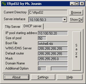network, where the terminal and the server are.Size of pool: the amout of this pool (specify at least 10).Boot File: type wtshell.nbi here.Mask: mask of the network, where the terminal and the server are.Then press "Settings" button and configure tftpd32 in this way: