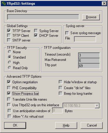 Configure tftpd32 main window in this way:
